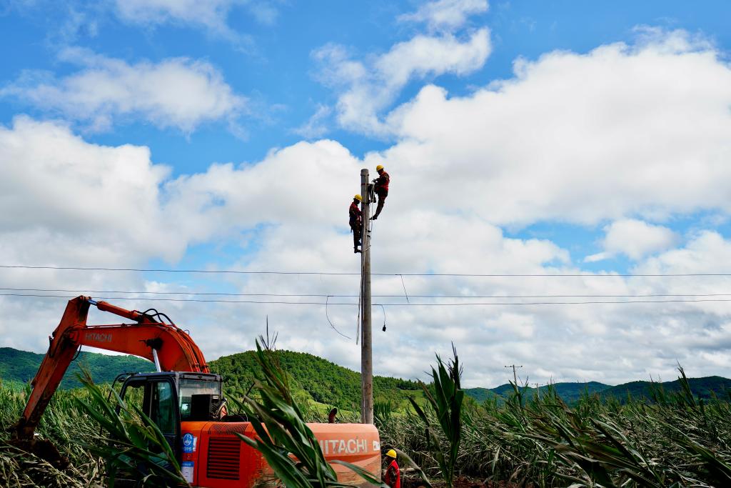 8月7日,在尚志市一面坡镇,尚志市供电分公司抢修人员开展杆塔扶正、加固工作。王润泽摄