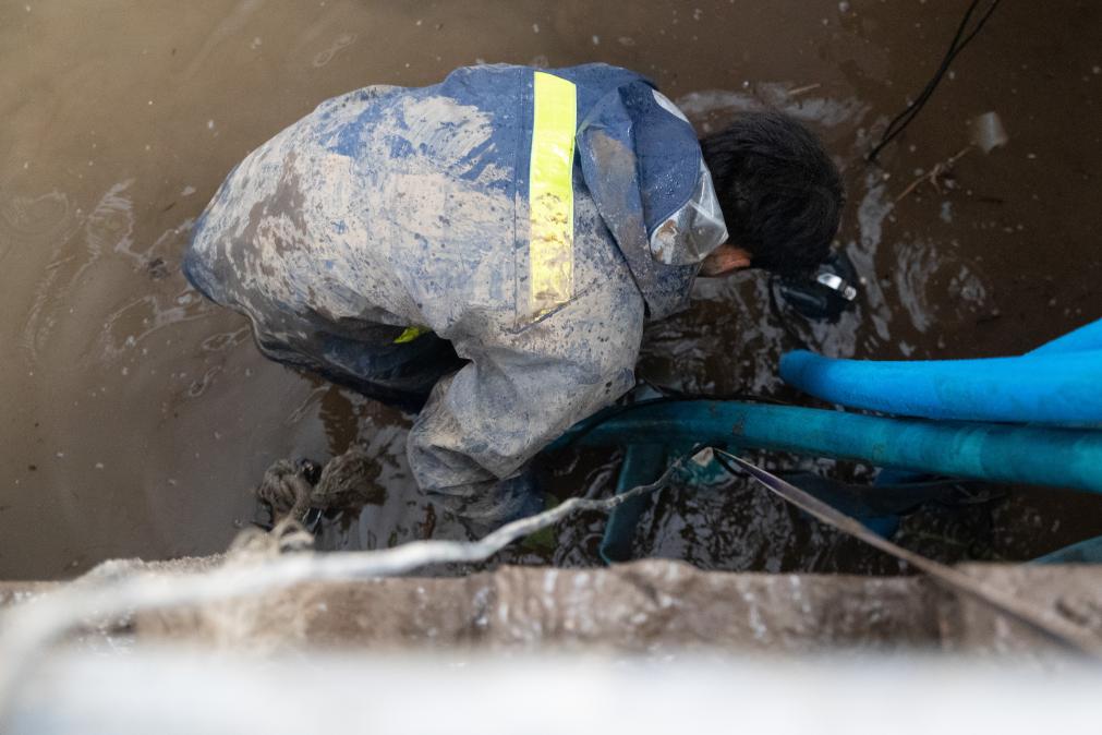 8月6日,在大海林林业局有限公司自来水供应站,工作人员正在清理室内淤积。新华社记者张涛摄