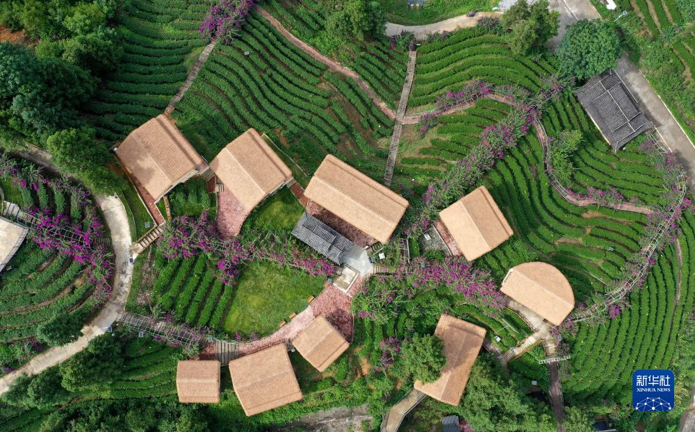 这是融水苗族自治县融水镇新安村水融香茶园茶叶种植基地(无人机照片,8月9日摄)。民宿、花廊、茶文化体验馆等文旅设施位于茶山上。