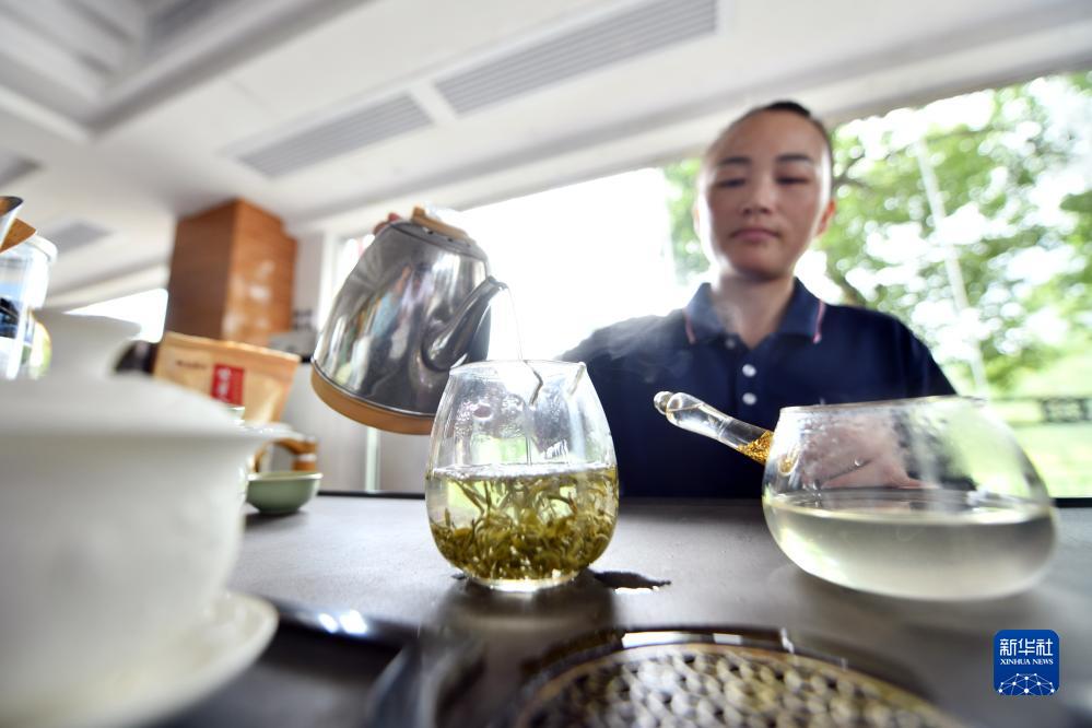 在融水苗族自治县融水镇新安村水融香茶园茶叶种植基地,茶艺师在向游客展示茶艺(8月9日摄)。