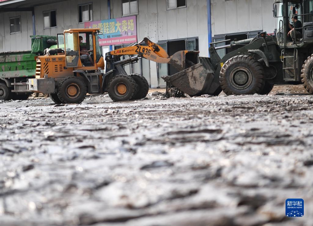 8月9日,车辆在涿州新发地大石桥农副产品批发市场清理淤泥。