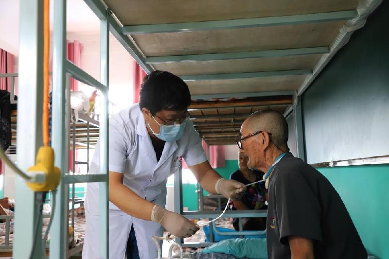 在廊坊市文安县苏桥镇临时集中安置点,医生正在为一名转移安置群众进行术后护理。(受访者供图)