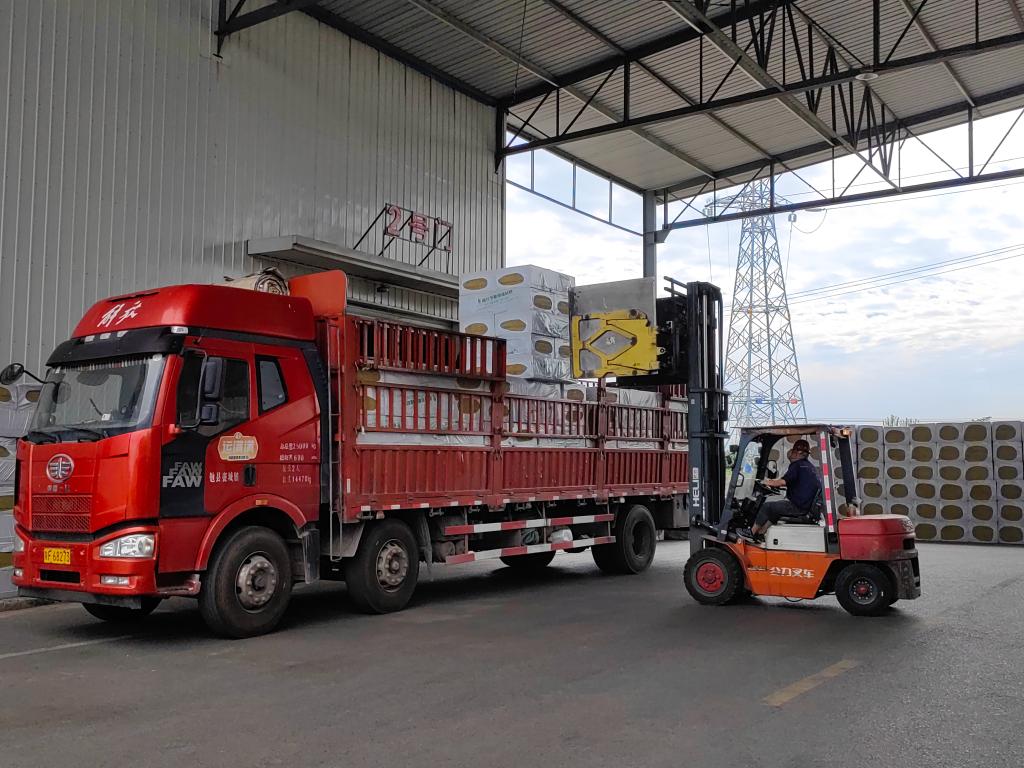 华晟永利保温材料科技有限公司生产的保温材料正在装车。新华社记者张斌 摄