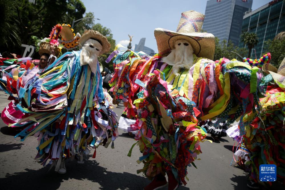 8月9日,在墨西哥首都墨西哥城,演员身着传统服饰参加世界土著人民国际日庆祝活动。
