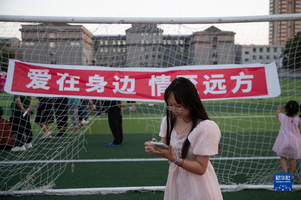8月9日,在五常市时代中学集中安置点,一位女士与朋友通过手机联系。
