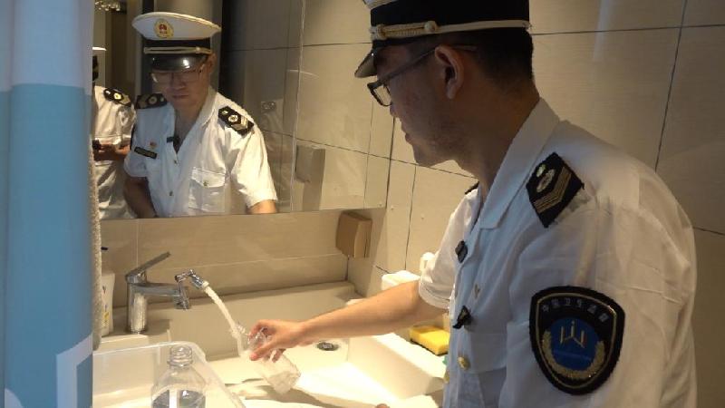 在居民家中,管鑫使用快速检测仪器对水中的游离余氯进行检测,结果显示,含量符合国家标准。