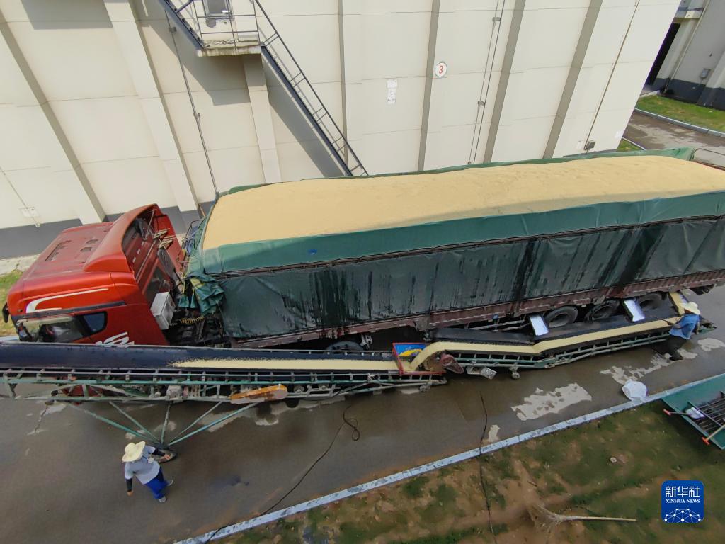 在江西省南昌县横岗国家粮食储备库,工作人员开仓卸载粮车上的早稻(8月8日摄)。
