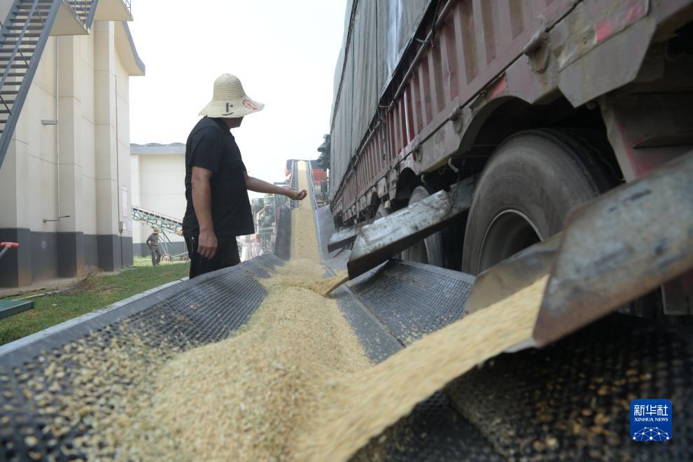在江西省南昌县横岗国家粮食储备库,种粮大户开仓卸载粮车上的早稻(8月8日摄)。