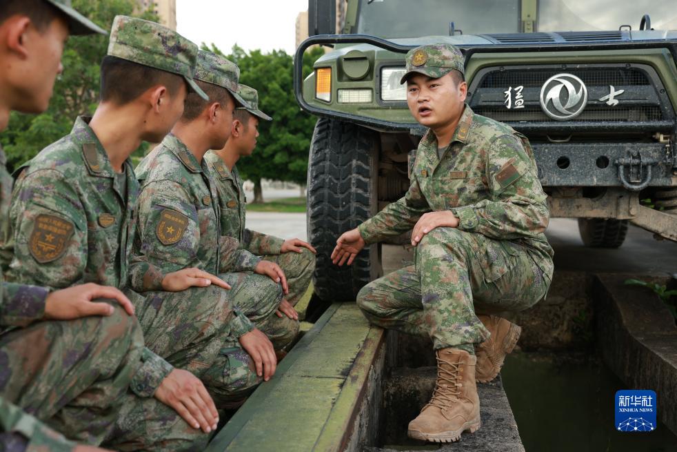 联勤保障部队某汽车团班长向跃东(右)在训练场给战友讲解课目技巧(2023年6月27日摄)。新华社发(刘宇 摄)