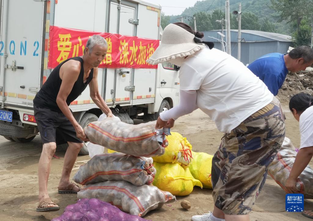 8月10日,涞水县赵各庄镇李各庄村的村民在搬运爱心人士捐赠的蔬菜。