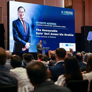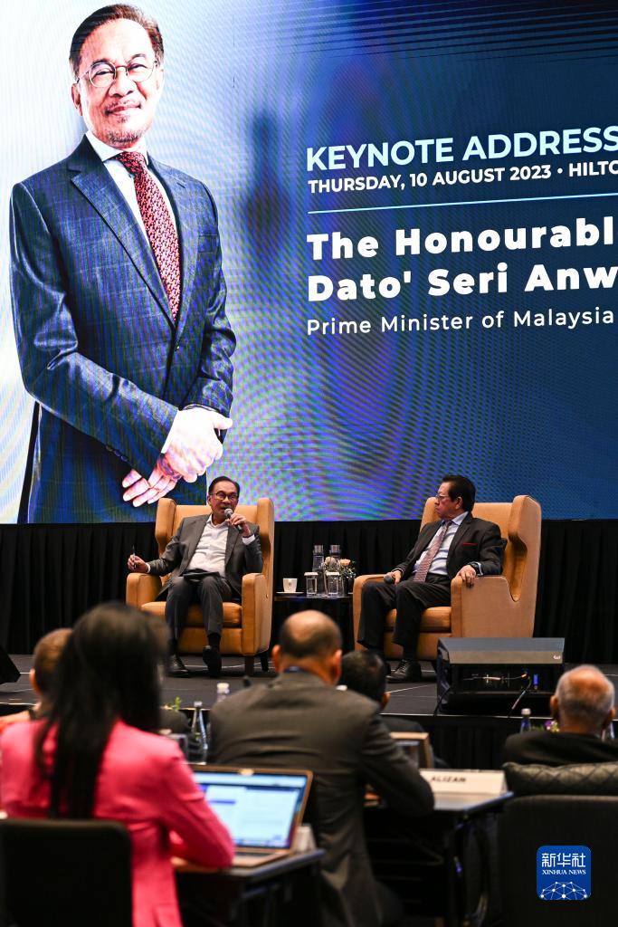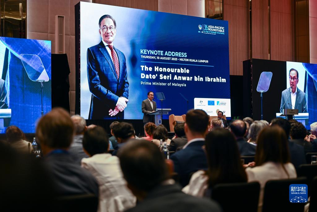 8月10日,马来西亚总理安瓦尔(中)在吉隆坡出席第36届亚太圆桌论坛。新华社记者 程一恒 摄