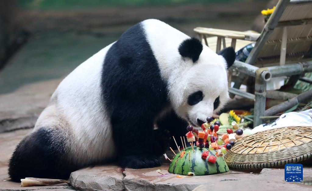 8月11日,大熊猫“刚刚”在鞍山动物园熊猫馆里品尝工作人员准备的“水果串”。