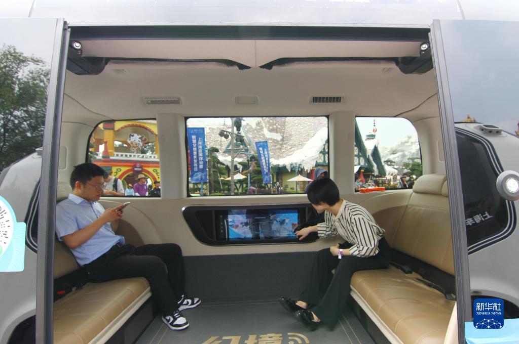 8月11日,受邀嘉宾在无人驾驶游览车内体验触屏操作。