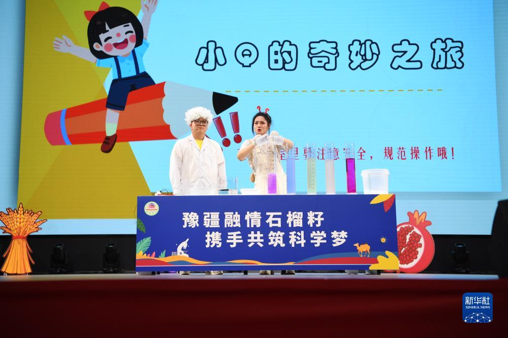 8月10日,在河南省科技馆新馆,工作人员在夏令营开营仪式上表演节目。