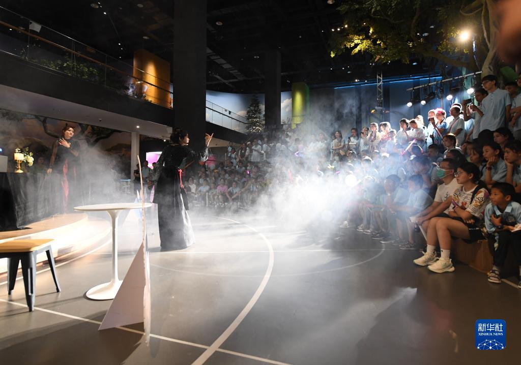 8月10日,夏令营学生在河南省科技馆“科学之夜”活动中观看科普剧。