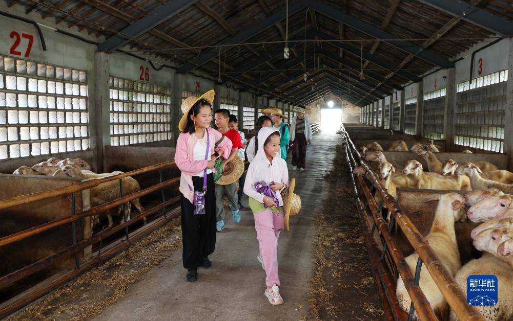 8月11日,在吴兴区道场乡钱山下粮油专业合作社,小朋友在参观湖羊养殖基地。