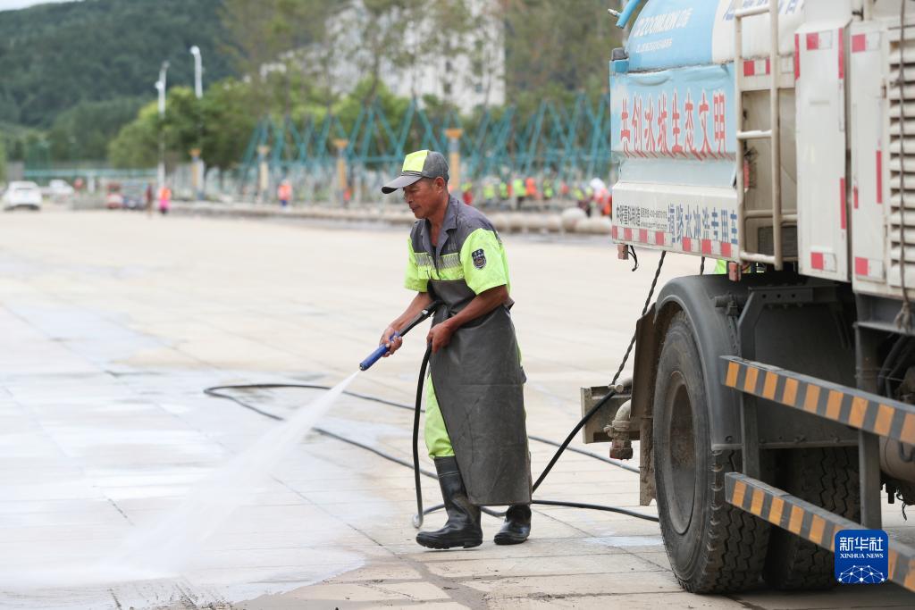 8月11日,在黑龙江省尚志市一处街道上,环卫工人在冲洗街道。