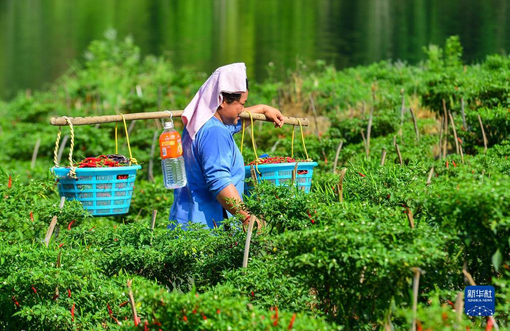 8月11日,在贵州省黔东南苗族侗族自治州从江县下江镇平江村辣椒种植基地,村民在挑运辣椒。