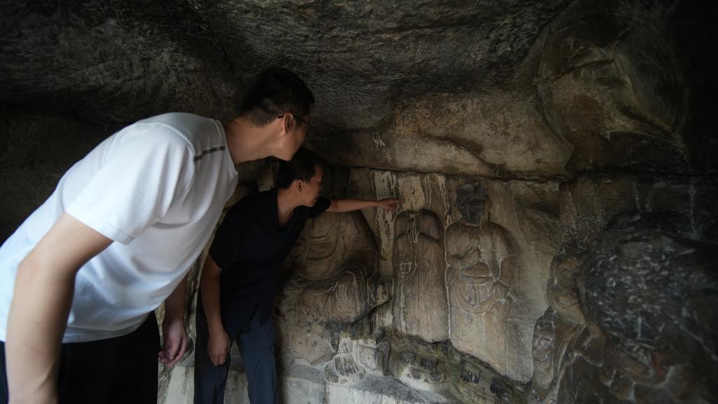 邯郸市峰峰矿区文物保护人员在水浴寺石窟查看文物受损情况。(受访者供图)