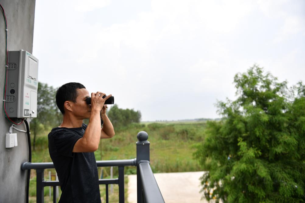 陈新在舵杆洲一处瞭望台查看湖区情况。新华社记者陈振海 摄