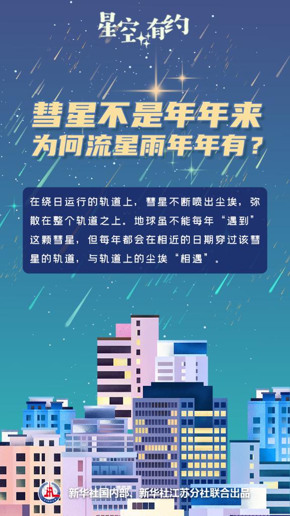 中国科学院紫金山天文台科普主管王科超说,要解释这个问题,首先得讲到流星雨产生的原因。流星雨的母体大多是彗星。彗星遗留在绕日运行轨道上的尘埃闯入地球大气层,发出光迹,就形成了流星。当流星“成群结队”划过大气层,地球上的人们就能看到流星雨。