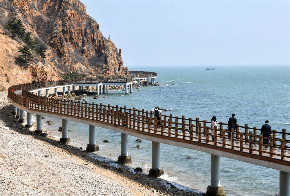 游人在烟台长岛海滨步行栈道上参观游览(2019年4月19日摄)。新华社记者 朱峥 摄