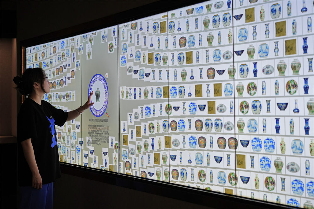 在山东烟台博物馆,观众通过互动屏幕了解中国古代瓷器(2023年5月18日摄)。新华社发(唐克 摄)