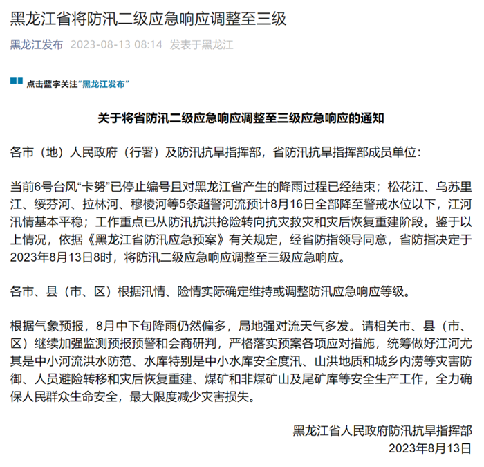 当前6号台风“卡努”已停止编号且对黑龙江省产生的降雨过程已经结束;松花江、乌苏里江、绥芬河、拉林河、穆棱河等5条超警河流预计8月16日全部降至警戒水位以下,江河汛情基本平稳;工作重点已从防汛抗洪抢险转向抗灾救灾和灾后恢复重建阶段。鉴于以上情况,依据《黑龙江省防汛应急预案》有关规定,经省防指领导同意,省防指决定于2023年8月13日8时,将防汛二级应急响应调整至三级应急响应。