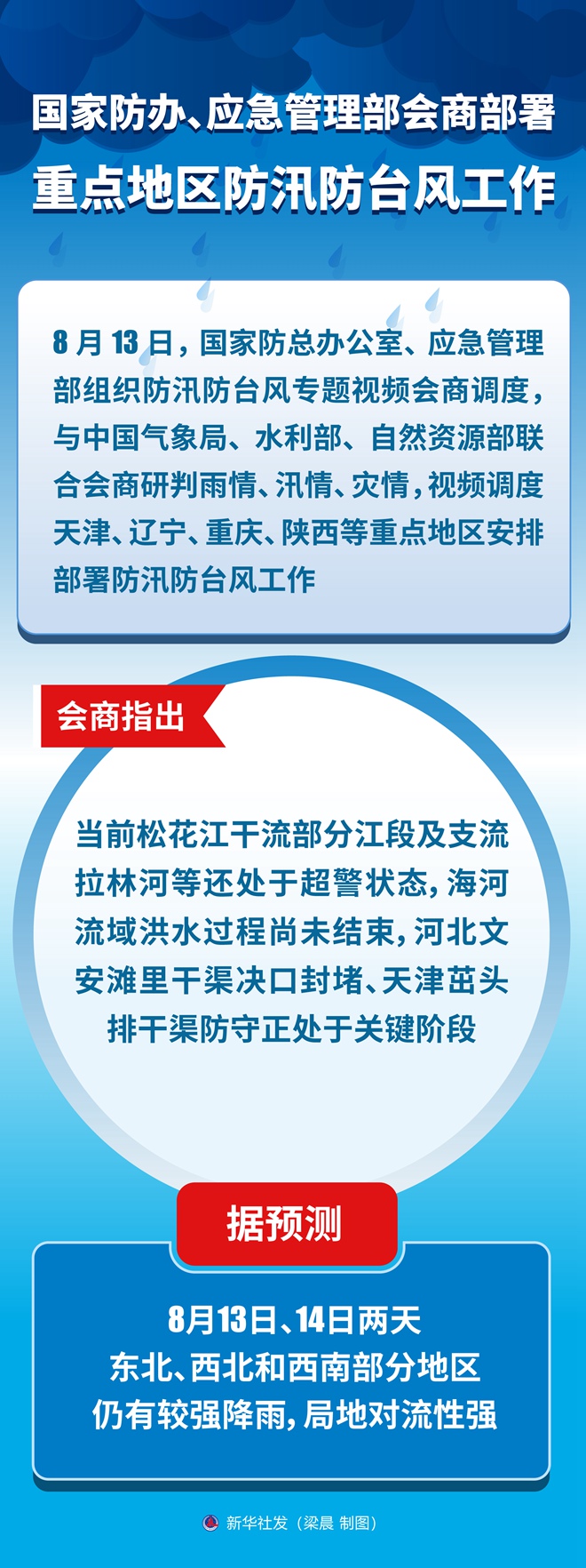 新华社北京8月13日电(记者王聿昊、周圆)8月13日,国家防总办公室、应急管理部组织防汛防台风专题视频会商调度,与中国气象局、水利部、自然资源部联合会商研判雨情、汛情、灾情,视频调度天津、辽宁、重庆、陕西等重点地区安排部署防汛防台风工作。