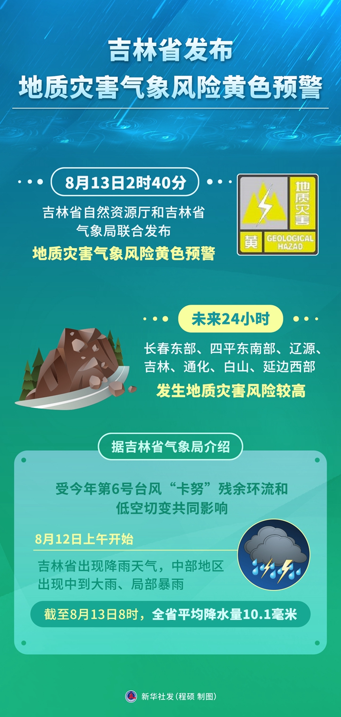 新华社长春8月13日电(记者王帆、马晓成)记者从吉林省气象局获悉,吉林省13日发布地质灾害气象风险黄色预警。
