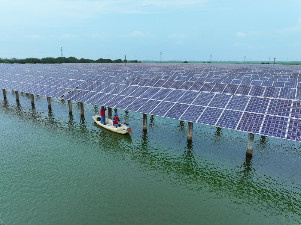 南昌市新建区松湖镇药湖,水面,太阳能光伏板延绵至天际;水下,鱼儿在欢畅游动。
