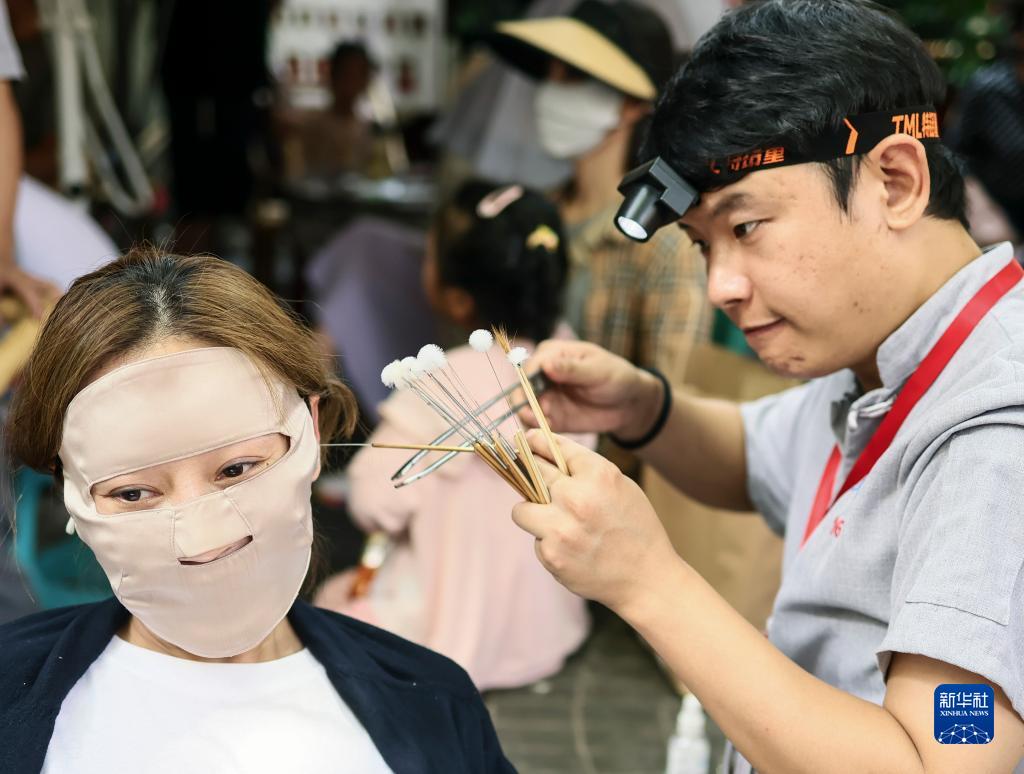 一位戴着“脸基尼”的女顾客在享受采耳服务(7月31日摄)。