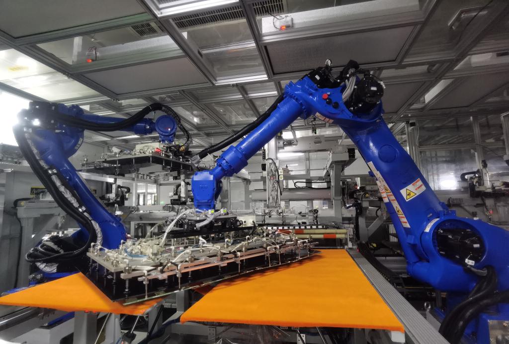 在位于青岛的海信视像智能车间生产线上,机器人对液晶面板和背光板自动化精准卡合(6月19日摄)。新华社记者王凯 摄