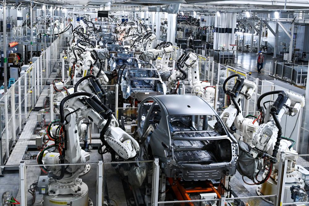 图为一汽红旗繁荣工厂焊装车间内,焊装机器人在生产线上焊接车身。新华社记者颜麟蕴 摄