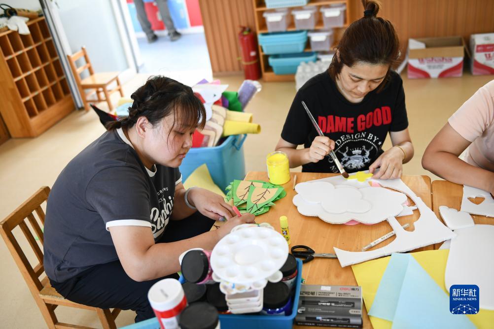 8月15日,在北京市房山区河北镇中心幼儿园东庄子分园,教师在一处临时腾出的教室制作欢迎入学的装饰品。