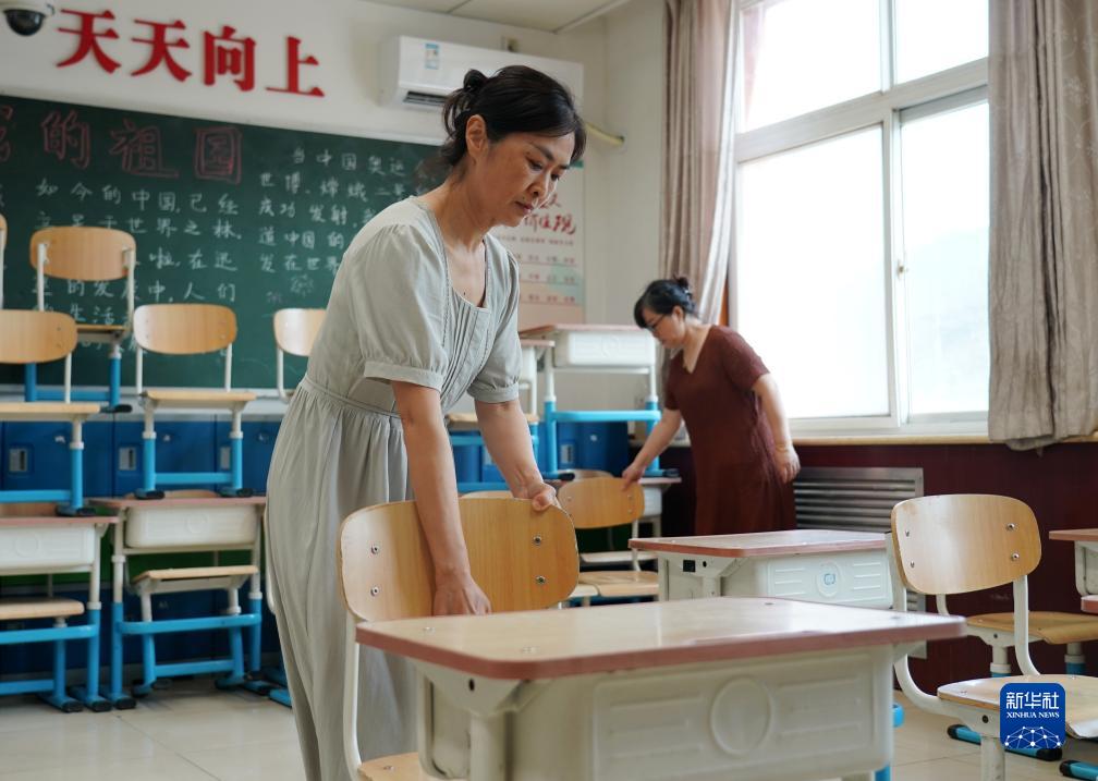 8月14日,北京市门头沟区妙峰山民族学校的工作人员在布置教室。