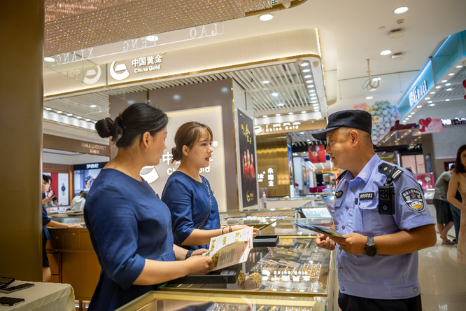 8月14日,安徽省合肥市公安局蜀山分局三里庵派出所民警深入辖区商场,以群众“看得见、容易懂、记得住”的方式开展反电诈、防盗窃、防火灾等安全知识宣传活动,加强安全防范提示,提高群众安全防范意识与能力。(方涛)