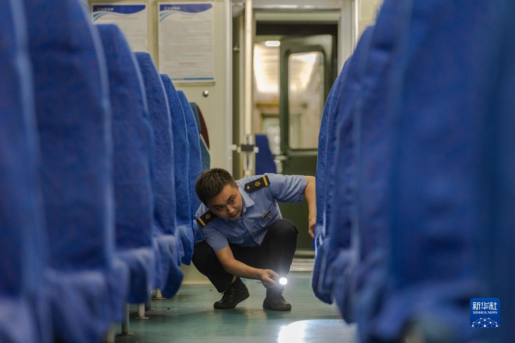 8月15日,重庆客运段列车长任炼在重庆西客车整备所检查列车隐蔽部位。