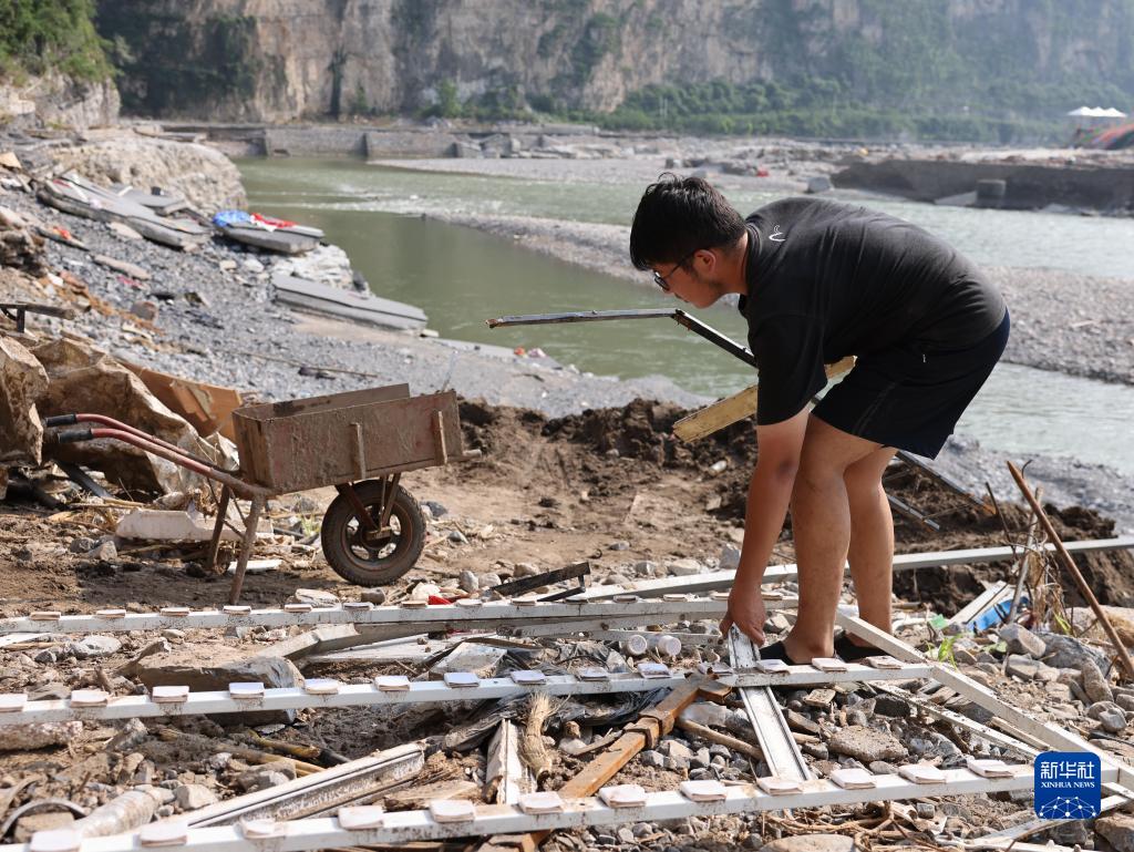 8月15日,河北涞水县三坡镇都衙村四背峪村民小组的村民在清理家中杂物。