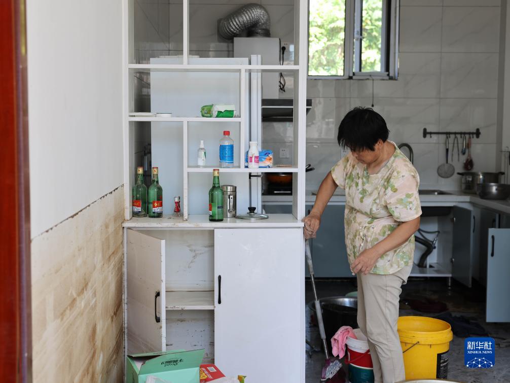 8月16日,河北涞水县九龙镇北龙门村村民在收拾清理家中物品。