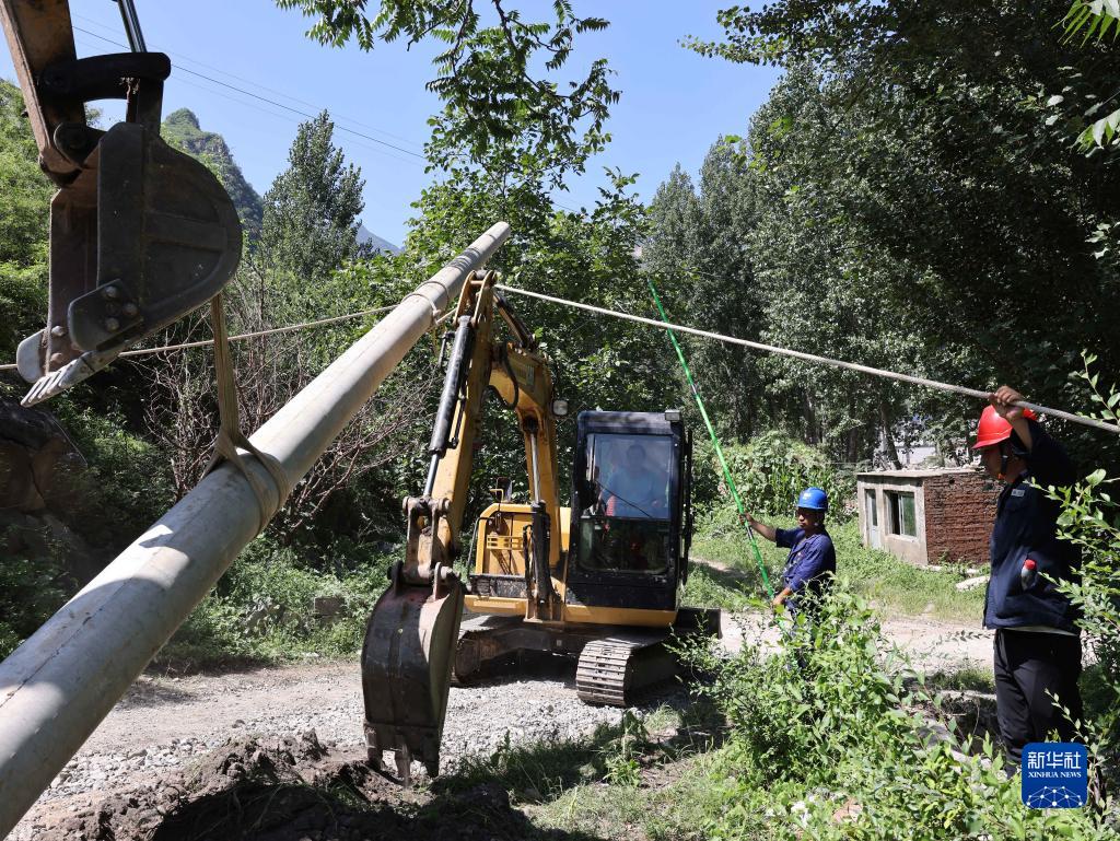 8月16日,电力公司施工人员在河北涞水县九龙镇北龙门村抢修电力设施。