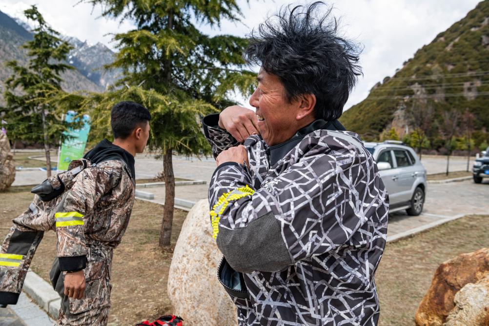 扎史品初(右)正在更换漂流用的连体服(4月14日摄)。新华社记者 孙非 摄