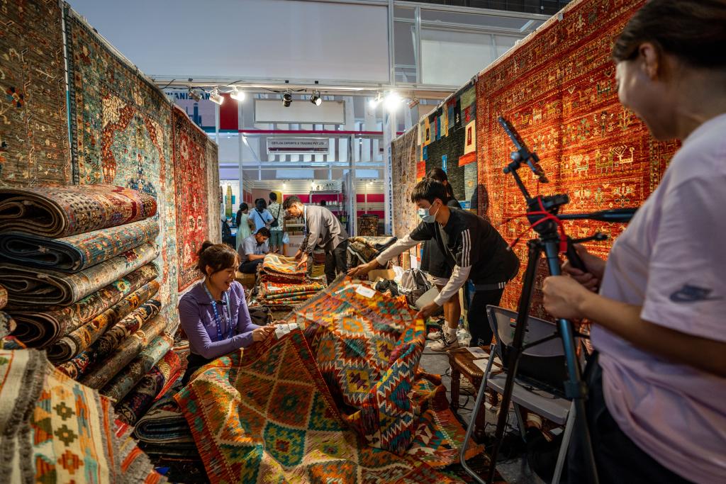 8月16日,工作人员在第七届中国—南亚博览会阿富汗展区直播带货。(新华社记者胡超摄)