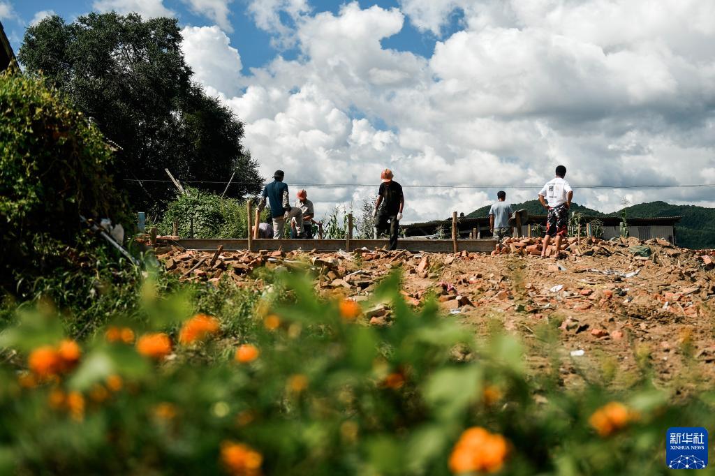 工作人员对舒兰市开原镇模范村的受损房屋进行重建工作(8月16日摄)。