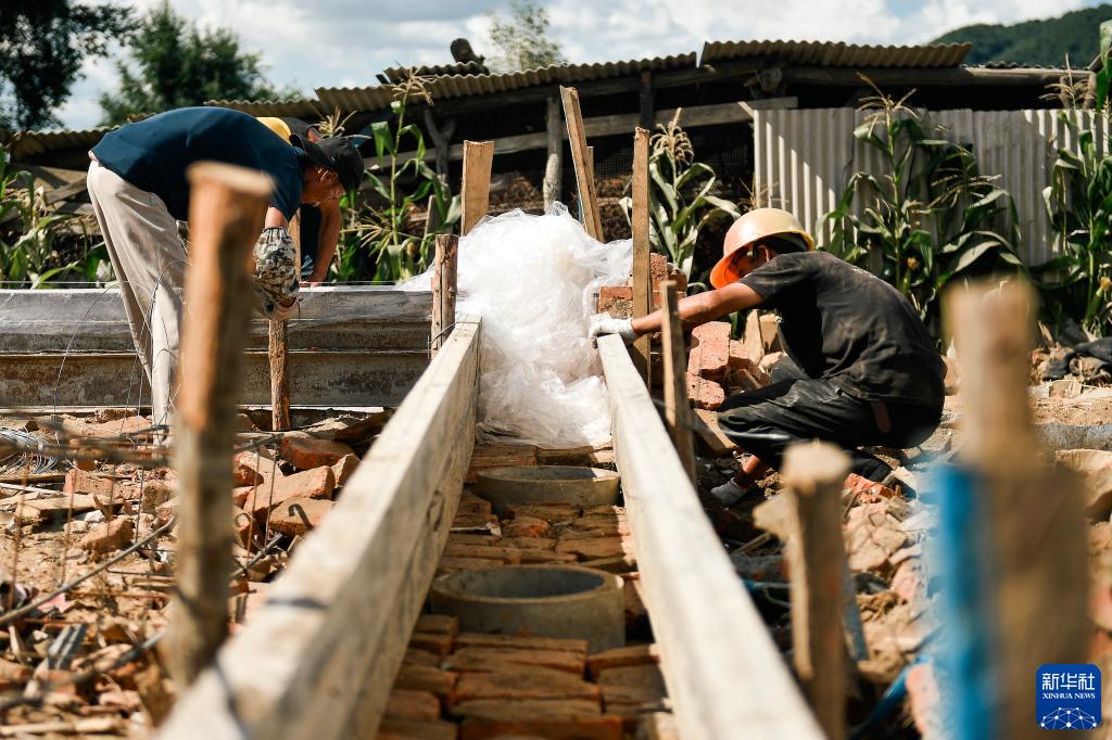 工作人员对舒兰市开原镇模范村的受损房屋进行重建工作(8月16日摄)。