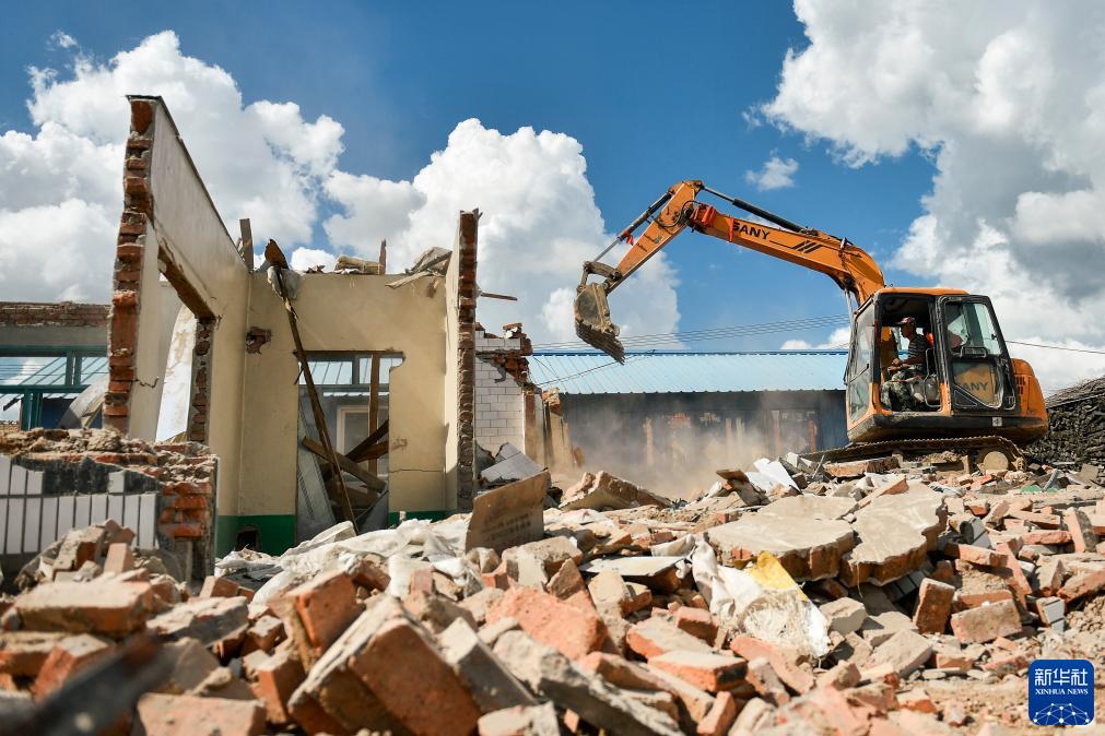 工作人员对舒兰市开原镇模范村的受损房屋进行拆除重建工作(8月16日摄)。