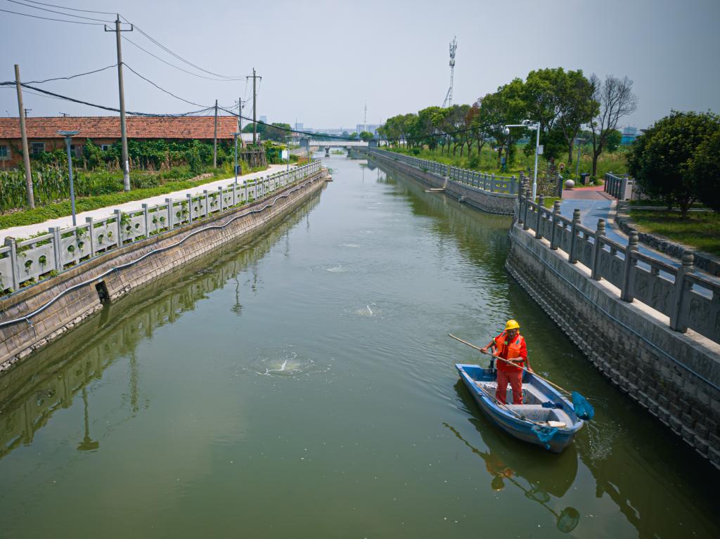工作人员驾驶小船在宁波市江北区西大河上清理水面(8月11日摄,无人机照片)。