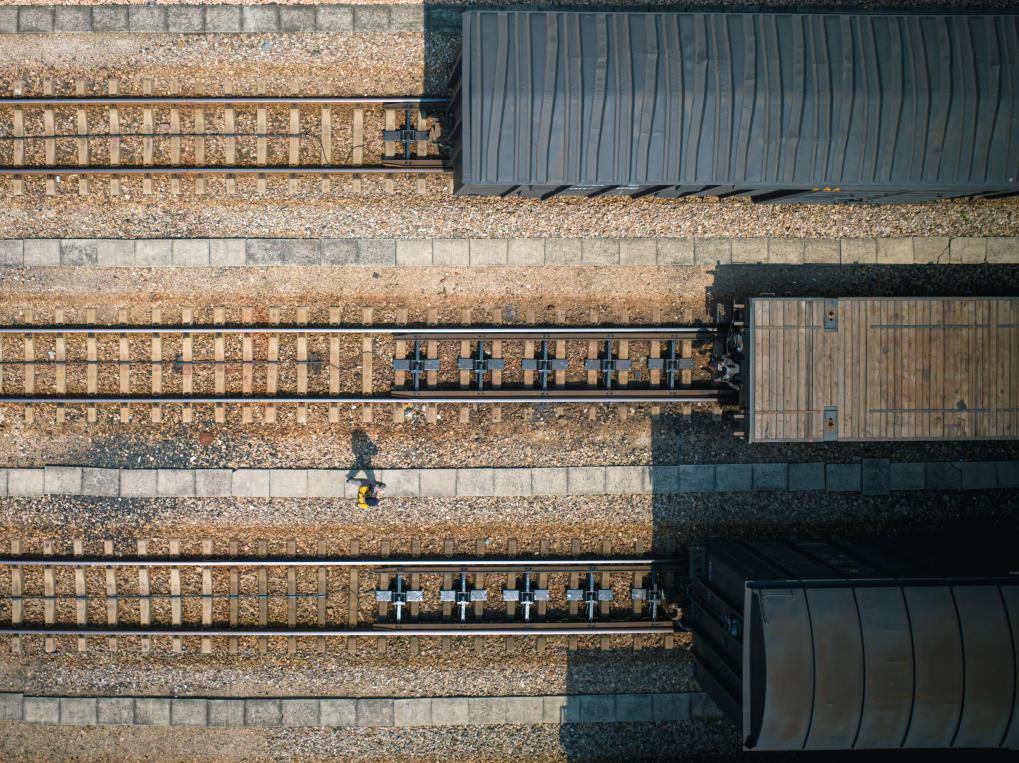 8月16日,在浙江杭州,铁路乔司编组站的调车员走向货车车厢准备进行调车作业(无人机照片)。
