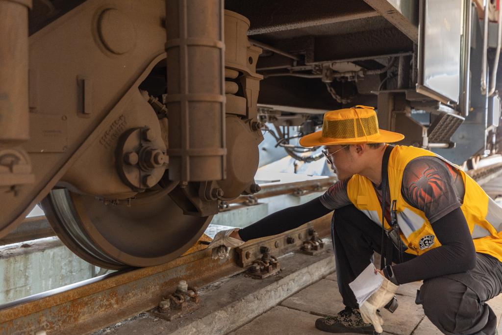 8月15日,重庆西站运转车间调车工作人员在重庆西客车整备所对入库列车安放止轮器。