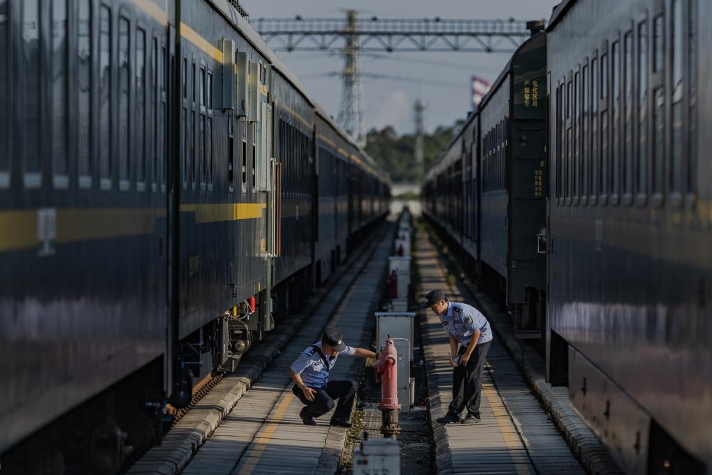 8月15日,重庆铁路公安处民警彭聪(左)、黄洲源在重庆西客车整备所对消防设施设备、器材进行巡视检查。